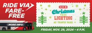 VIA Home > VIA and H-E-B partner for fare-free service to Tree Lighting > VIA23_Ride VIA Fare free to Christmas Tree Lighting WEB 766×277