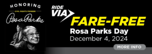 VIA Home > VIA Honors Civil Rights Icon with Fare-Free Service Wednesday > VIA24_Ride Fare Free for Rosa Parks Day WEB 766×277